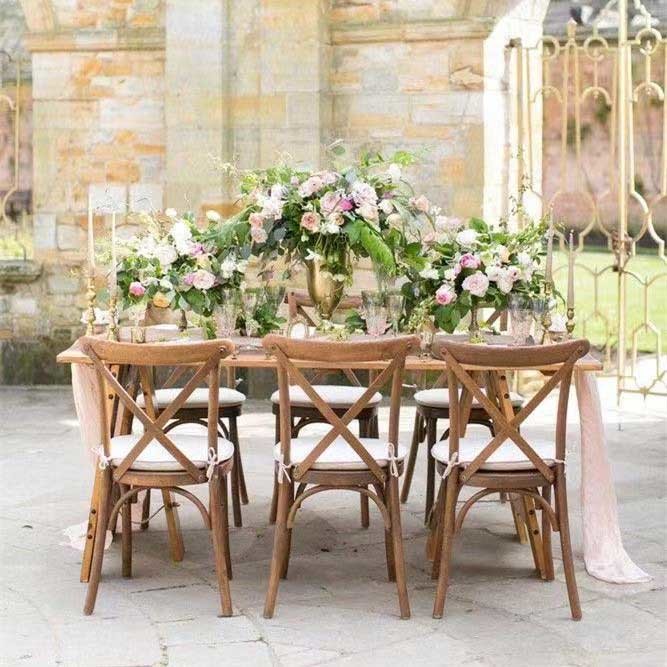 These wedding chairs feature a Tuscan-inspired design with a natural wood finish and the signature "X" on the back. Cross-back chairs embody rustic elegance and are one of the most popular wedding chair rental styles for farms, gardens, vineyards, and barn venues.